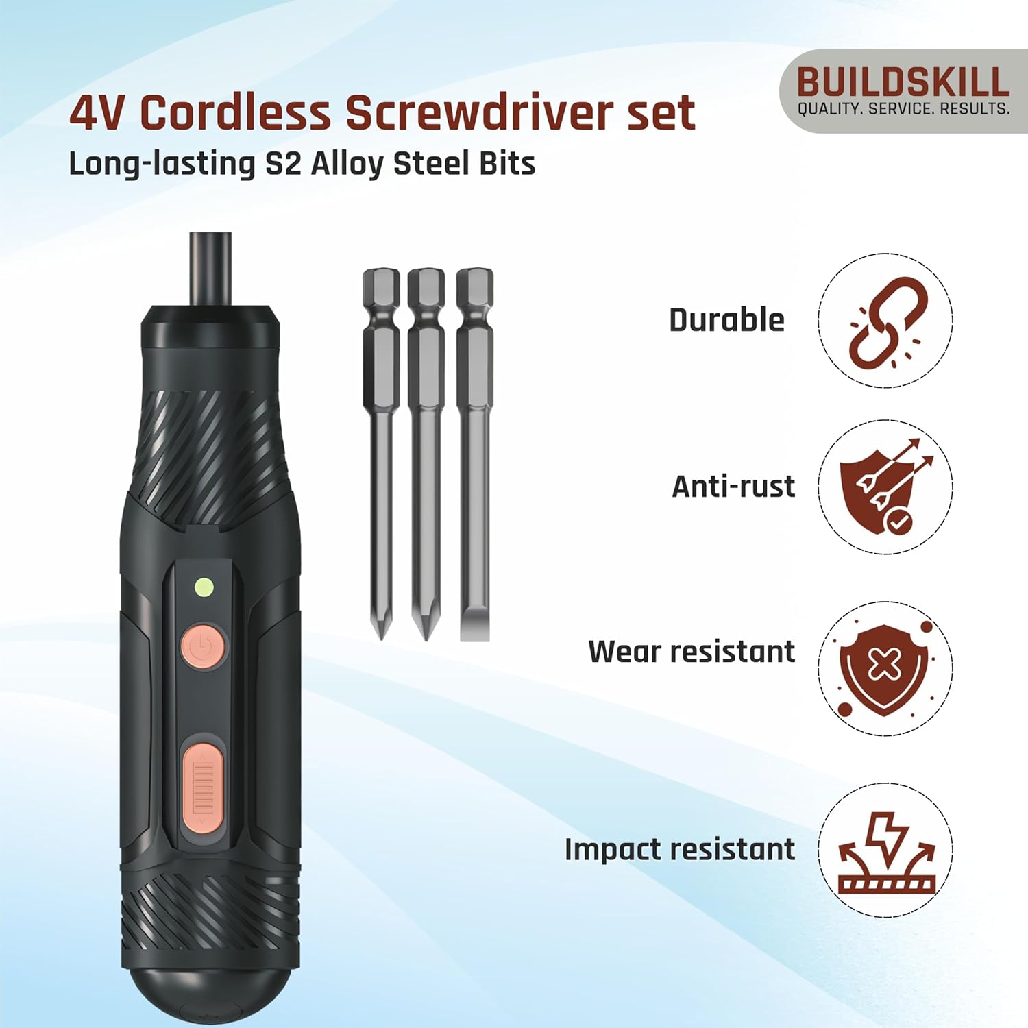 - Durable S2 Alloy Steel Bits – The Buildskill 4V Cordless Screwdriver comes with long-lasting, anti-rust, wear-resistant, and impact-resistant S2 alloy steel bits, ensuring extended use and precision for wood, wall, electronic, and watch repairs. Perfect for both professionals and DIY enthusiasts.
